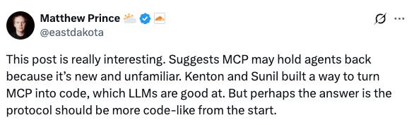 The headline: “we’ve all been using MCP wrong.” Cloudflare CEO Matthew Prince’s follow-up: MCP should be “more code-like” because “LLMs are really good at understanding code, less good at understanding quasi XML.” The takeaway in the discourse: MCP got something fundamental wrong.